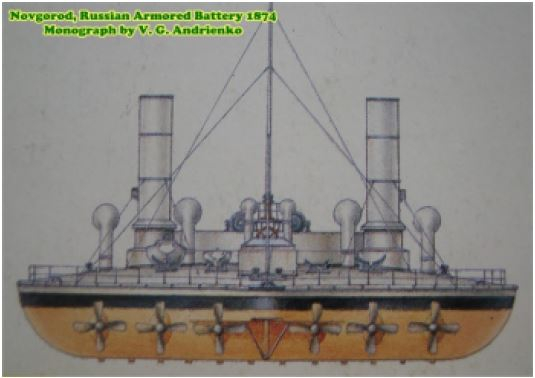 The first, the Novgorod, was a perfect circle, but the second of the class, the Vice-Admiral Popov, was squeezed little in the middle. Built in Russia between 1873 and 1875, Novgorod was 101 feet in one direction and 101 in another, with a draft of 14 feet while Popov was reported to be 126 feet long with a beam of only 117 feet. Both carried two large guns in a single barbette mounted in the middle of the dinner plate.