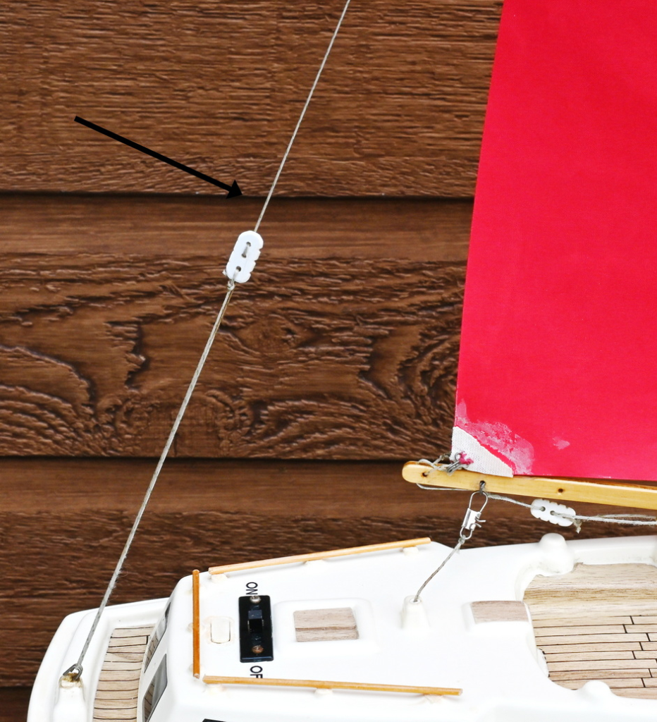 So I decided to replace all of the rigging. This may sound complicated but it really isn’t. Each set of lines may have a different name but I used a Gorilla brand non-stretching very strong line for each one of them. Unless you have quite a large boat string lines will do the job and are much easier to deal with than wire. Here are the lines we need for any sloop rigged sailboat: