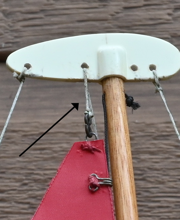 Upper and lower shrouds – These lines extend from the top of the mast (uppers) or the top 2/3 of the mast (lowers) to the outer edge of the deck (gunwale). Since the 575 is quite small uppers have been eliminated as the mast will never bend with the small sails she carries. See Figure 1. The shrouds are made adjustable with neat little plastic tensioners called bowsies. See Figure 2.