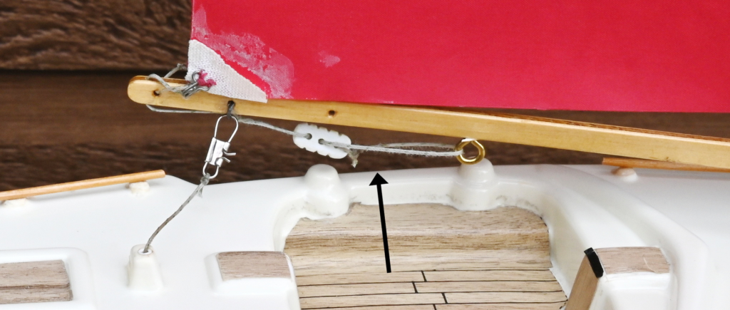 The final line to be considered is the boom vang which keeps the boom level as the sheets are let out. It goes from a point on the underside of the main boom from a point about 1/3 along from the mast and it attached to an eyelet near the base of the mast (same one as used for the downhaul above). Usually a bowsie is attached for adjusting, however, on this size of boat there simply wasn’t room. See Figure 7.